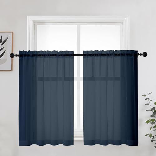 OWENIE Blue Sheer Curtains 36 Inches 2 Panels Set - Kitchen Tiers Valances Curtains Light Filter Rod Pocket Voile Cafe Curtains for Kitchen Bathroom Small Half Window, 42 in W x 36 in L, Navy