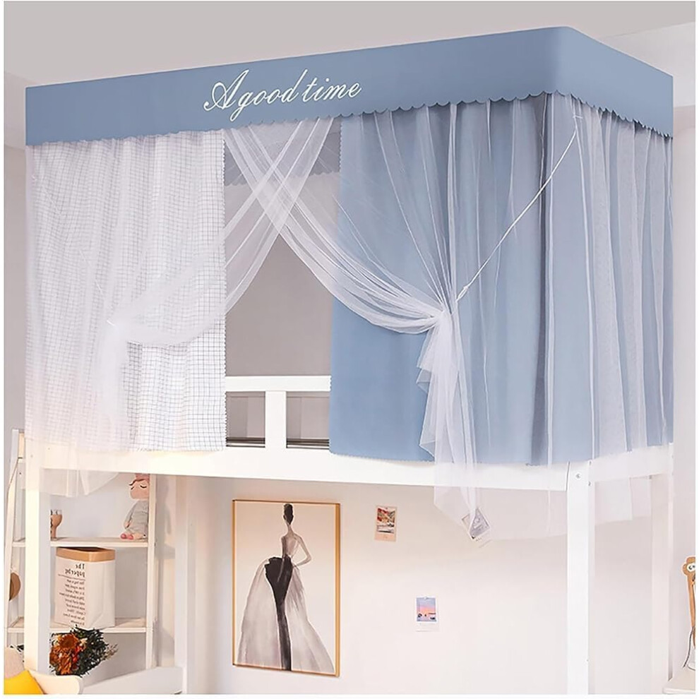 Privacy Protection Bed Frame with 4 Corner Posts, Bed Canopy, Pink Baldachin for Upper Loft Bed, Light Blue Curtains