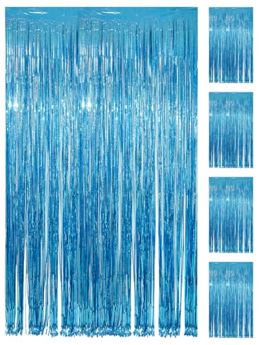 Kioneer Metallic Tinsel Curtains Light Blue 5 Packs 3 ft x 10 ft, Foil Fringe Curtains for Photo Backdrop Door Wall Hanging Window Curtain Party Office Decoration