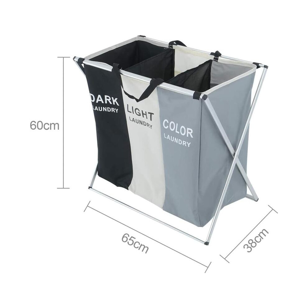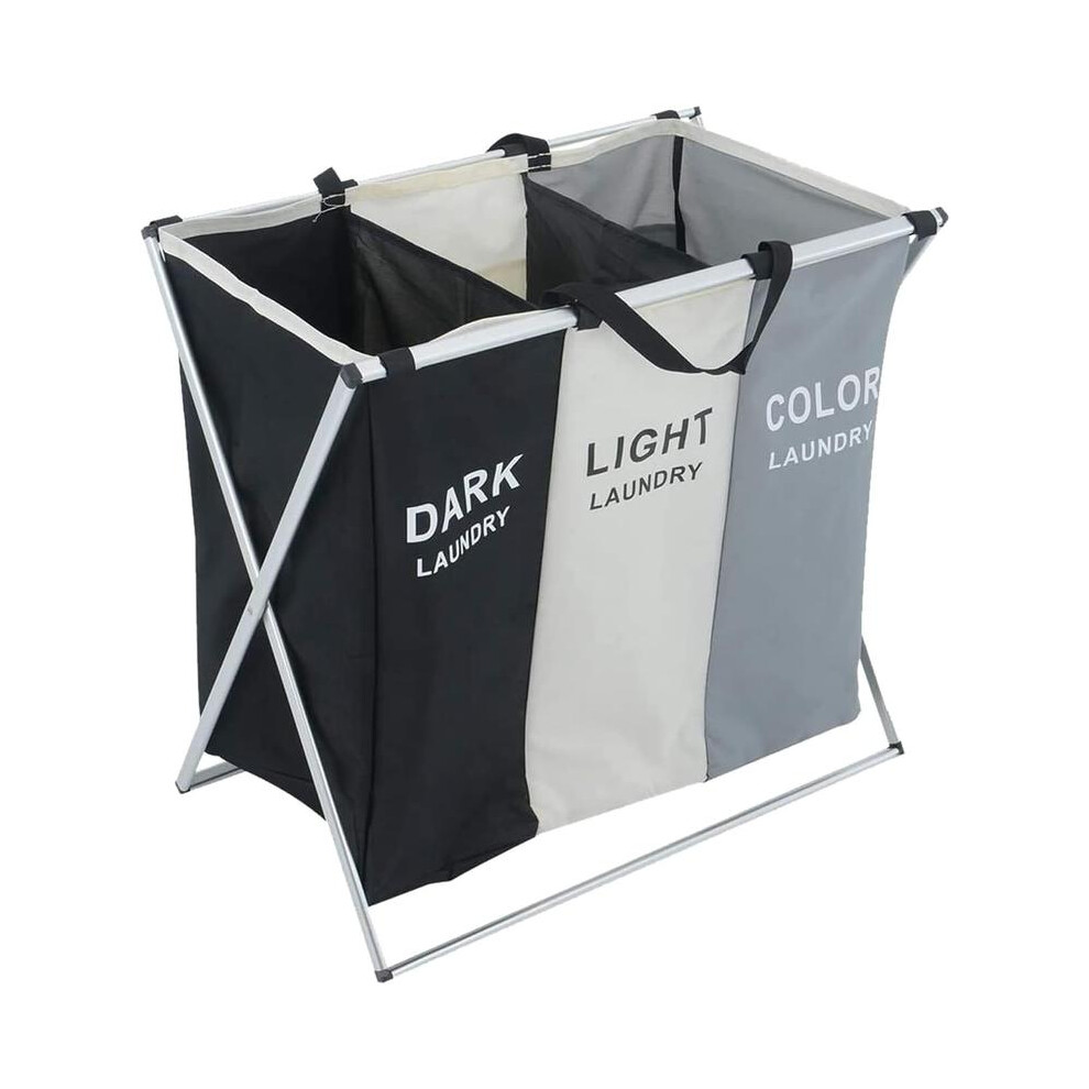 (Default) Large Laundry Basket 3 Sections Aluminium Folding Laundry Cloth Basket Washing Hamper Bin Storage Bag Light Dark for Bedroom Black an