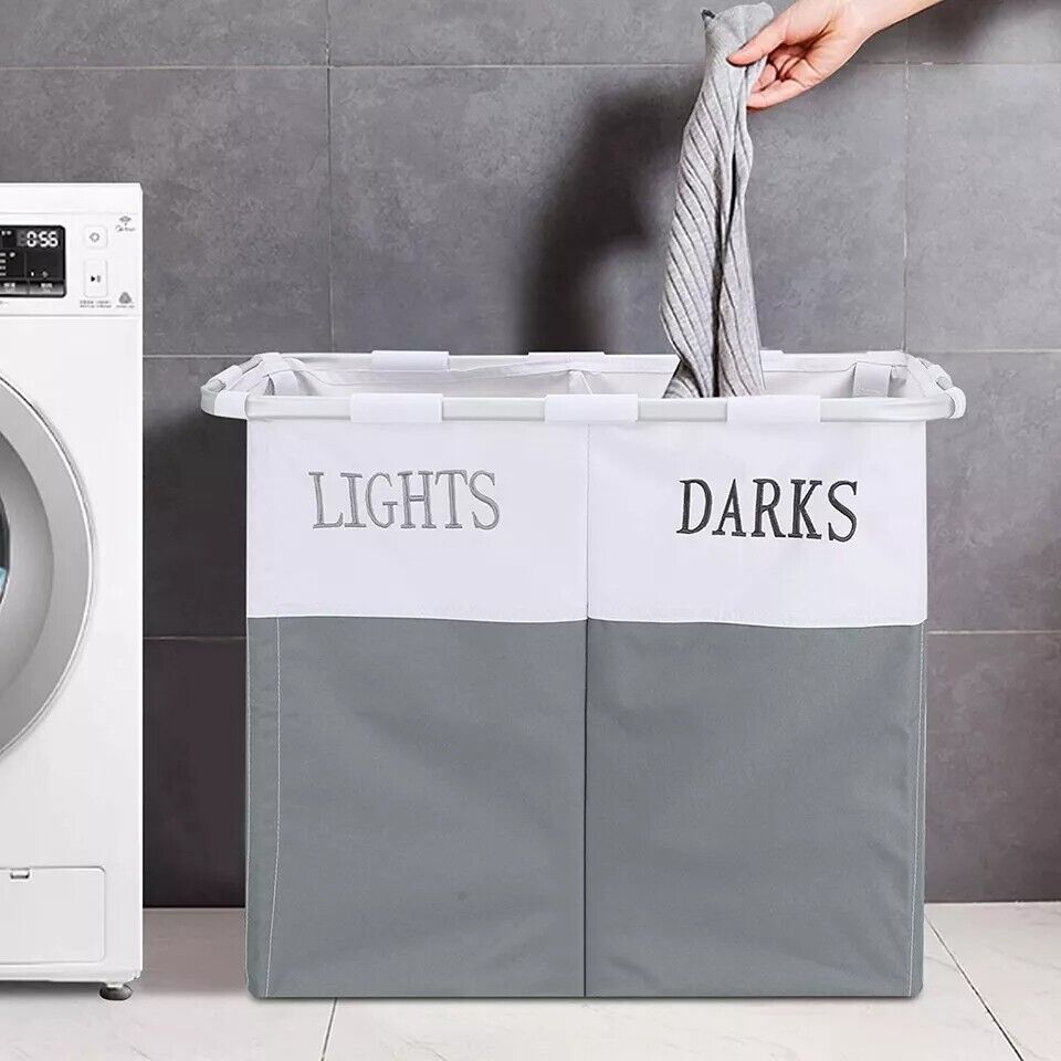 Folding Laundry Clothes Washing Storage Hamper Bag Basket Dark & Light 2 Section