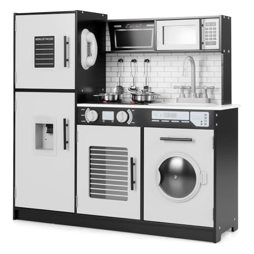 COSTWAY Kids Wooden Kitchen, Pretend Play Kitchen with Light, Sound, Oven, Washing Machine, Microwave, Water Dispenser, Telephone & Utensils, Children Chef Role Playset for Boys Girls (Grey+Black)