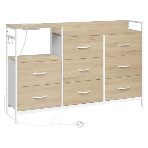 WOLTU Chest of 8 Drawers, Drawers Dresser with Charging Station, Fabric Drawer Unit for Bedroom, Playroom, Closet, Living Room, Light Oak Effect+White, Metal Frame, E1 Engineered Wood, SSK007whe-UK