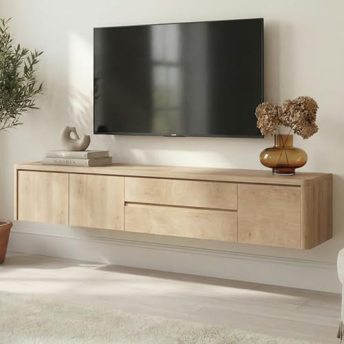 TFFCIC 180cm Light Oak Floating TV Unit with Storage, Fully Assembled Wall Mounted TV Cabinet with Drawers for Living Room, Fits up to 85 Inch TVs, 18mm German-Veneered Multi-Layer Plywood
