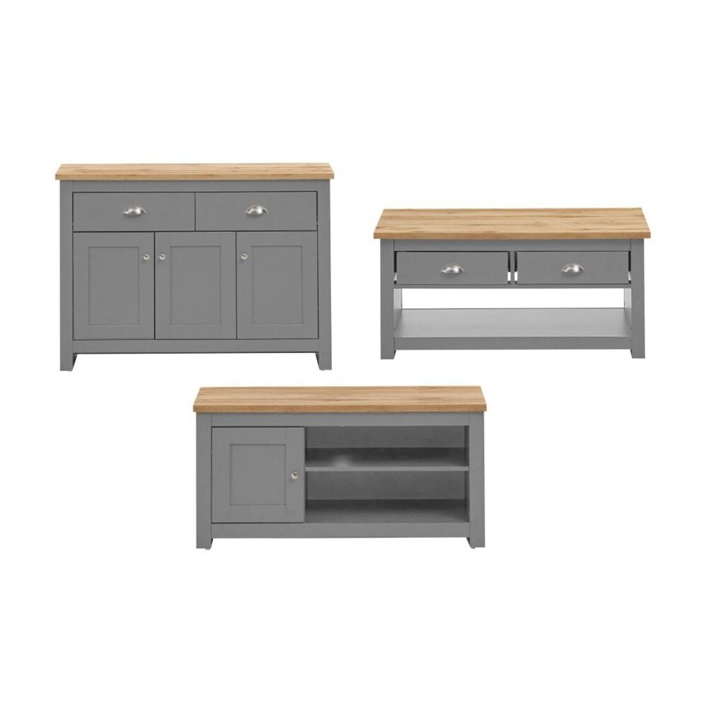 Lisbon Light Grey 3-Piece Living Room Set with Oak Tops: TV Unit, Sideboard & Coffee Table
