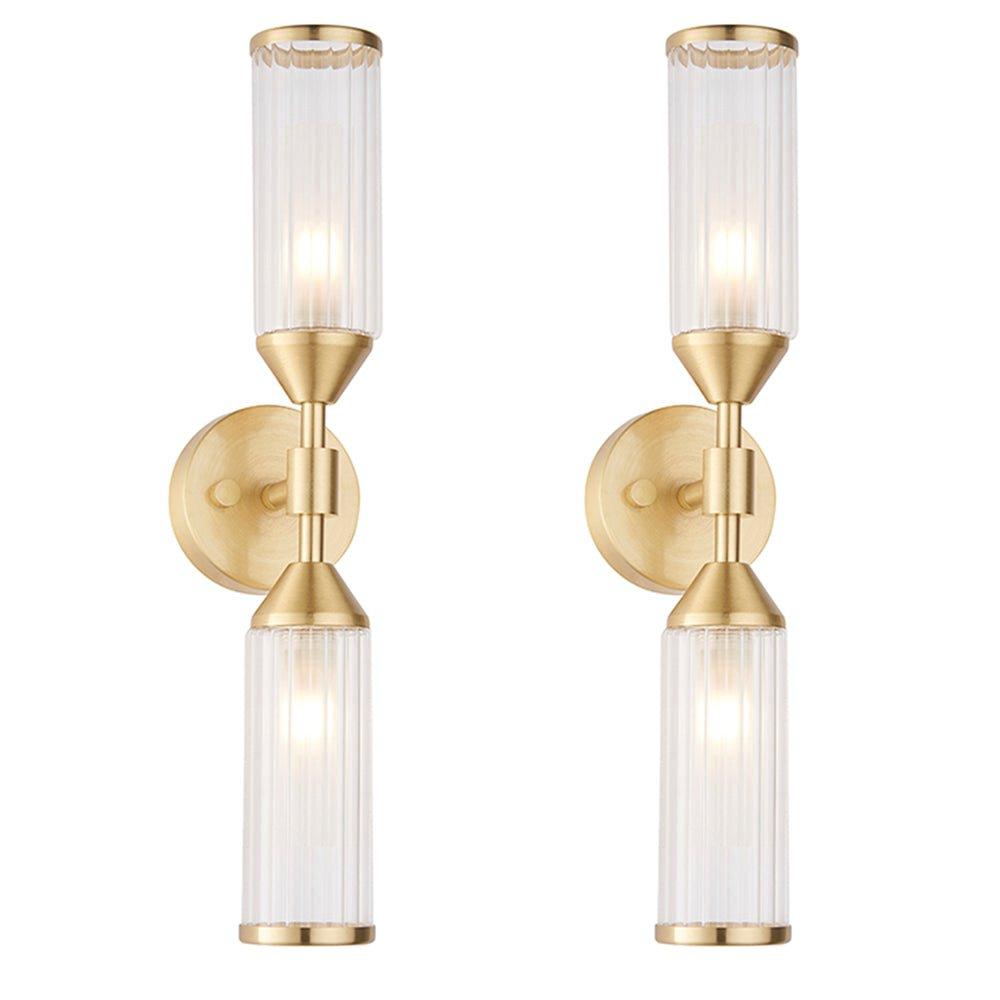 2 PACK Satin Brass Twin Wall Light & Ribbed Glass Shades Frosted Glass Defusers