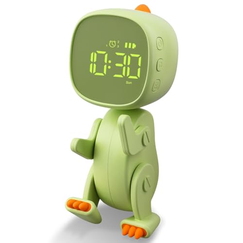 Reinscer Children'S Digital Alarm Clock, Three Alarms, Dinosaur Alarm Clock with Variable Shape, Snooze, Night Light Timer Green