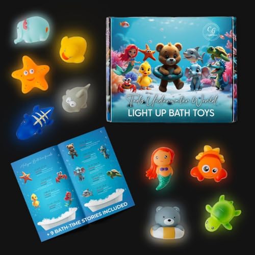 CalmGenix Set of 9 Light Up Bath Toys for Kids, 9PCS LED Sensory Bath Toys with 9 Bonus Interactive Stories Included & Packed In a Box – Fun for Parents with Newborns & Toddlers