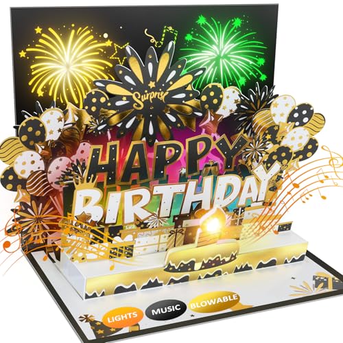 Birthday Card, Musical Pop Up Birthday Cards w Firework Lights, Blow Out LED Light Candle & Play Happy Birthday Music Pop Up Card, Greeting Cards Gifts for Him or Her, Black Gold (Blowable Candle)