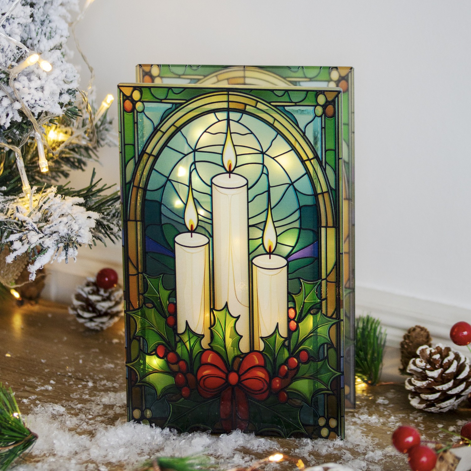 Stained Glass Light Up Christmas Candle Decoration LED Table Top Xmas Ornament