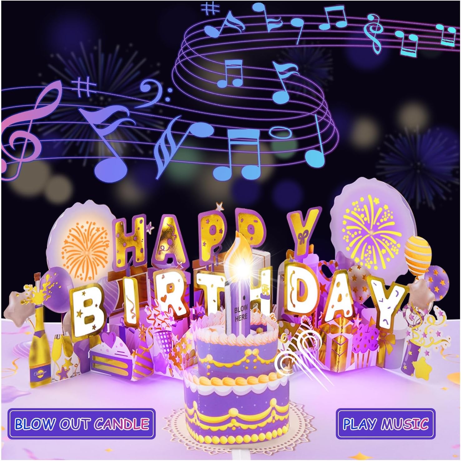 Birthday Pop Up Card for Women: 3D Musical Birthday Card with Light, Greeting Card Blowable Candle, Personalised Birthday Gifts for Wife, Mum, Daughter, Sister, Kids Men