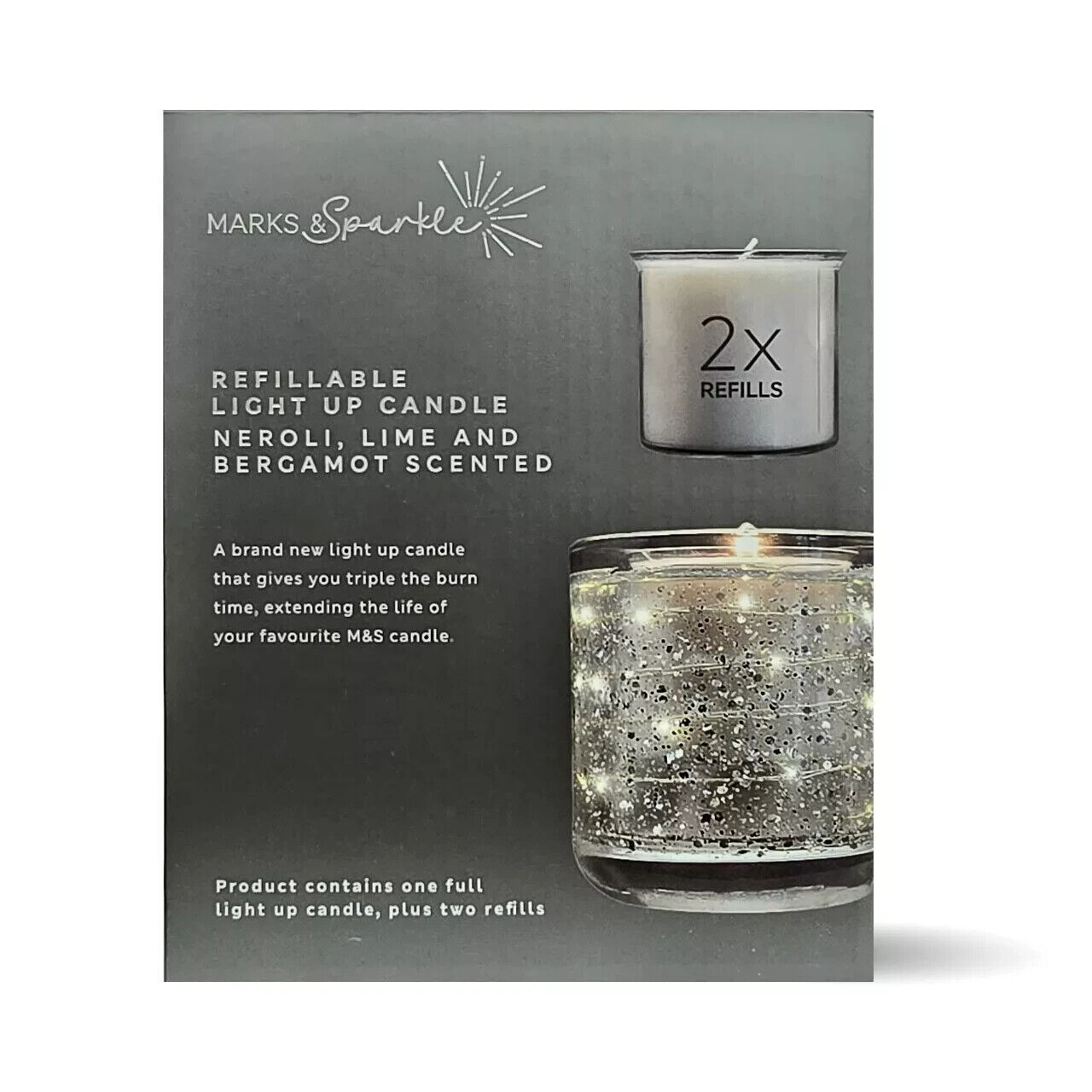 M&S Light Up Candle LED Neroli, Lime & Bergamot Scented Silver Set with Refills