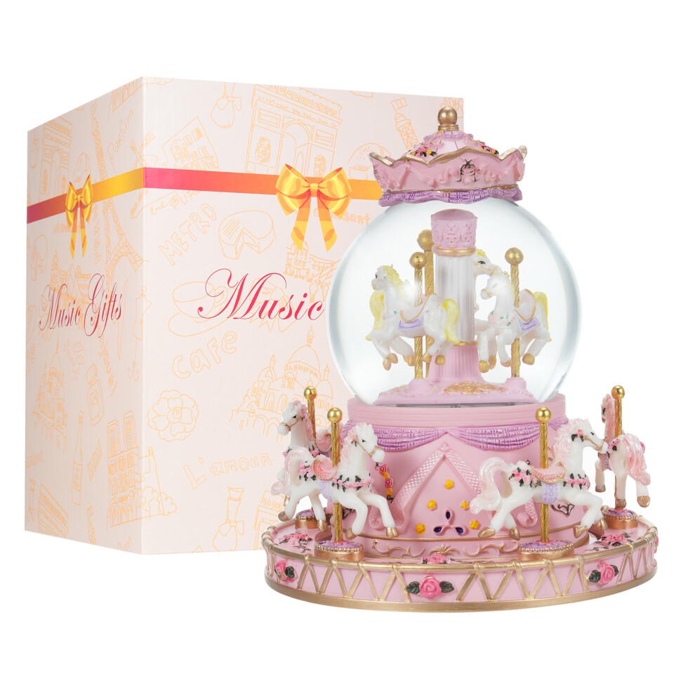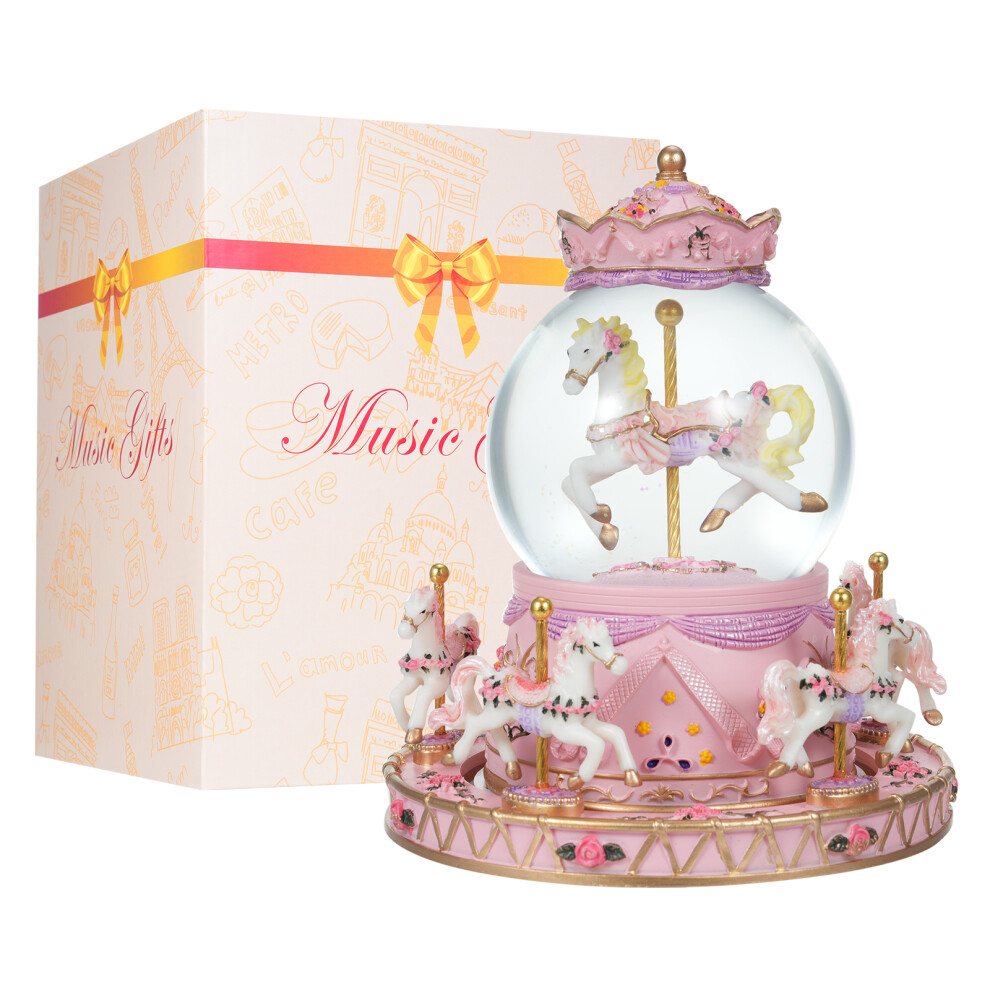 Rotating Carousel Music Box Crystal Ball Light-up Snow Globe Wind-up Musical Box Colorful Lights Cute Little Horses Girls Festival Birthday