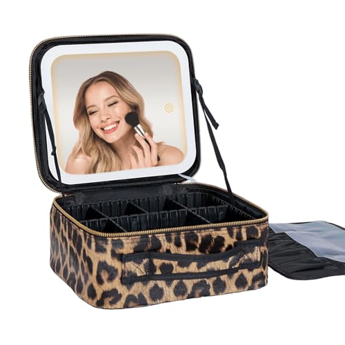 Makeup Bag with LED Mirror Cosmetic Travel Case with Light up Mirror Portable Makeup Artist Organizer Bag with Adjustable Dividers Makeup Brush Holder Storage Black Leopard Print Elitzia ET10602
