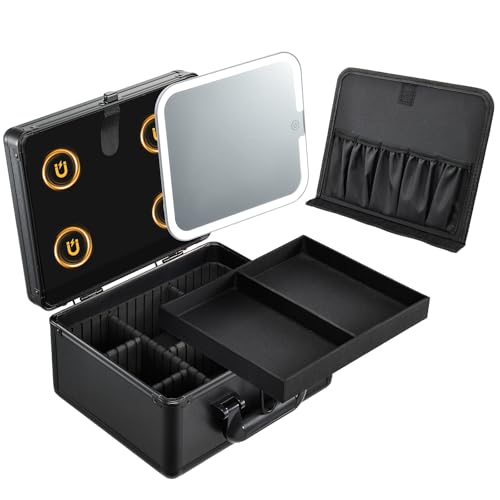 Vanity Case with LED Mirror Makeup Box Removable Light Up Mirror Portable Beauty Case Makeup Artist Carry Vanity Box with Adjustable Dividers and Makeup Brush Holder, Black