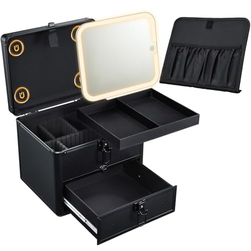 Vanity Case with LED Mirror Makeup Box Removable Light Up Mirror Portable Beauty Case Makeup Artist Carry Vanity Box with Adjustable Dividers and Makeup Brush Holder (Black with Drawer)