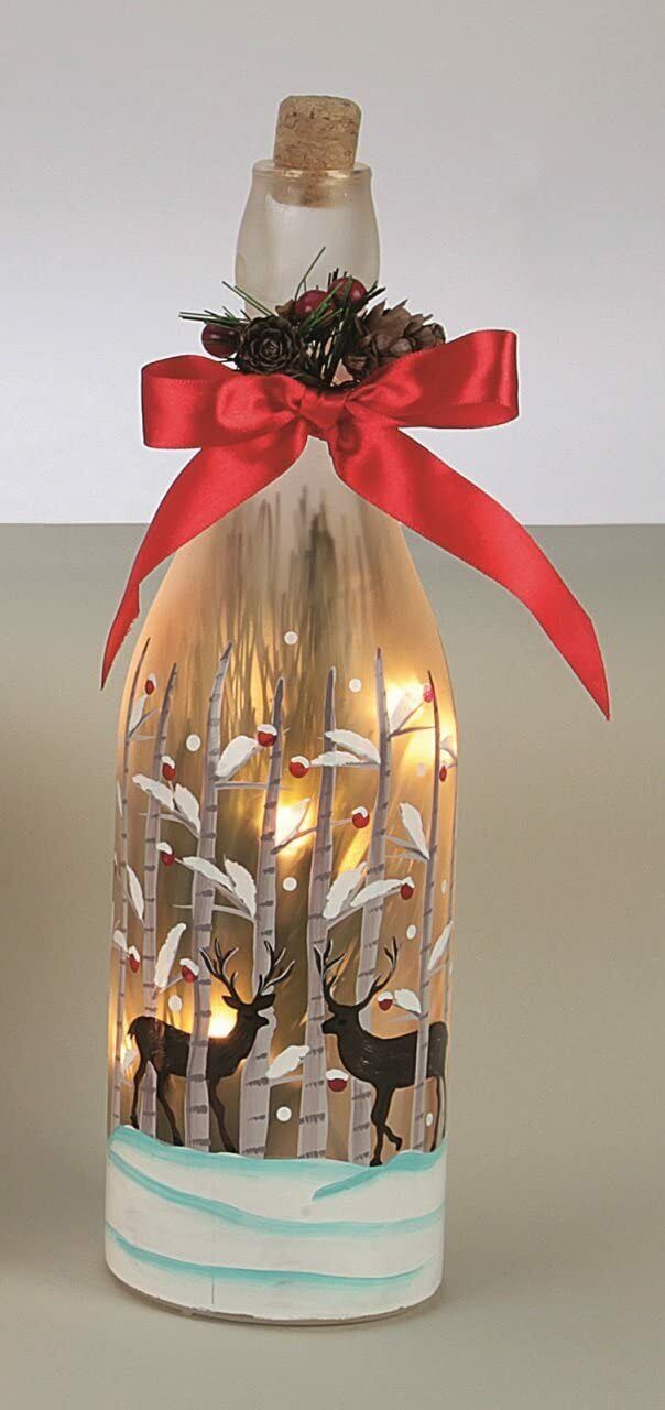 Christmas Light up Glass Bottle 29cm Reindeers Hand Painted Festive Fun