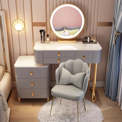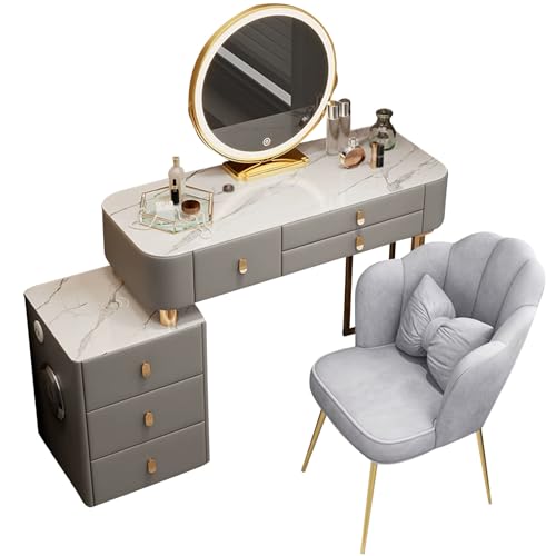 Preferspace Table Make Up Vanity Adjustable Light Mirror 3 Modes Detachable Left Right Cabinet USB Bluetooth Speaker Wireless Charging Metal Legs Velvet Seat