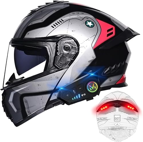 Bluetooth Modular Motorcycle Helmet with Tail Light, ECE/DOT Approved Motorcycle Helmet, Flip Up Adult Motorcycle Helmet with Double Visor, Built-in Speaker Microphone, for Men Women D,XXXL=63-64cm