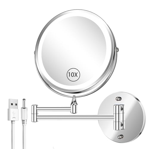 FFowcye 8” Lighted Wall Mounted Makeup Mirror, Double Sided 1X/10X Magnifying Bathroom Shaving Mirror with Lights, 54 LED Wall-Mount Cosmetic Vanity Mirror, 360° Swivel Extendable Arm