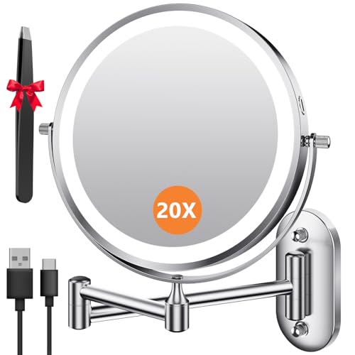 Auxmir Lighted Wall Mounted 20X Magnifying Makeup Mirror, 8" Double-sided 360° Swivel Shaving Mirror with Extendable Arm, 3200mAh Rechargeable Dimmable Mirrors with Tweezer for Bathroom and Hotel