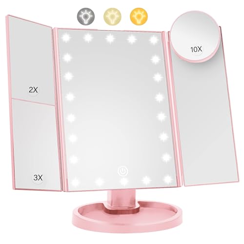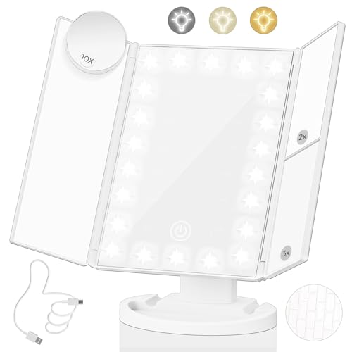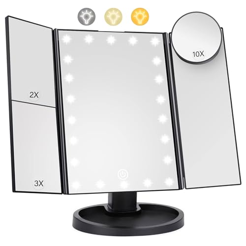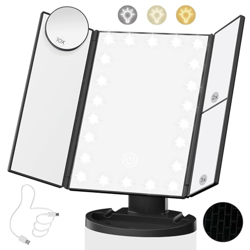 Beautifive Tri-Fold Travel Lighted Makeup Mirror, 5000mAh Rechargeable Light Up Magnifying Mirrors 1X/3X/10X, 3 Color Lighting&Stepless Dimming, Ultra Bright and Multi-Angle Adjustment