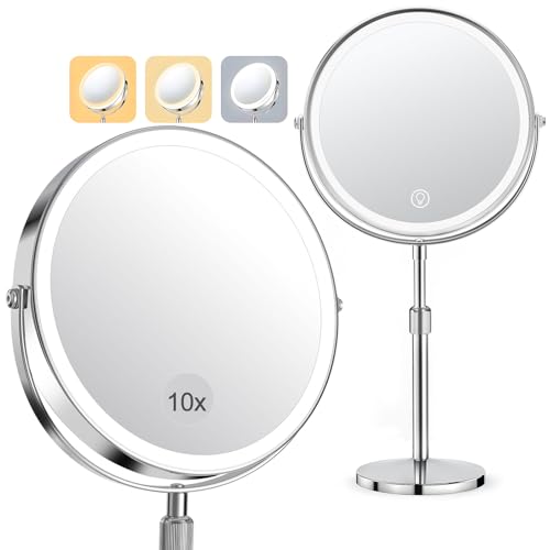 SURFOU 8" Makeup Mirror with Lights on Stand, 10X Lighted Magnifying Mirror with Height Adjustable Brightness & 3 Color Dimmable Lights, 2-Sided Height Adjustable Vanity Mirror - silver