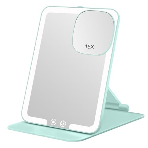 Rechargeable 1500mAh Travel Makeup Mirror with Lights,Portable 1X Vanity Mirror with 15X Magnifying Mirror,Folding Lighted Cosmetic Vanity Mirror with Adjustable Stand,3 Color Lighting,Dimmable