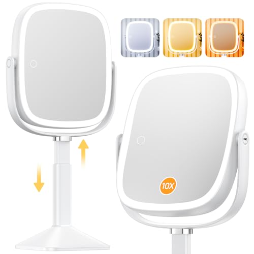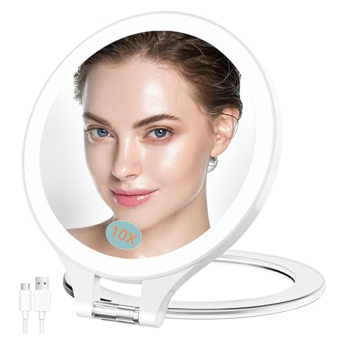 Famihomii Magnifying Mirror with Light 10X/1X, Double Sided Rechargeable Travel Mirror with Light with 3 Color Setting Adjustable Lighted Vanity Mirror Portable Desk Cosmetic (White 10x)