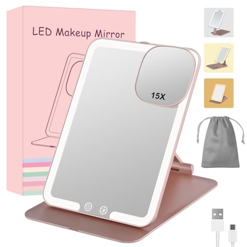 Rechargeable Travel Makeup Mirror with 15X Magnifying,Folding Lighted Cosmetic Tabletop Mirror with Adjustable Stand,3 Color Lighting,Dimmable Touch
