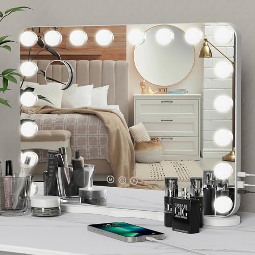 GloBrite Hollywood Vanity Mirror with 15 Dimmable LED Bulbs - 3 Lighting Modes, 10x Magnification, Touch Control, USB Charging, Wall/Tabletop, Lighted Makeup Mirror for Bedroom, Dressing Room - White
