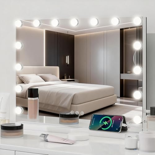 YU YUSING Hollywood Makeup Mirror, 45×58cm Large Lighted Vanity Mirror, Tabletop or Wall-Mounted Mirror, with 15 Dimmable Bulbs, 3 Color Modes, Touch Screen Control, 10X Magnifier, USB Output Port