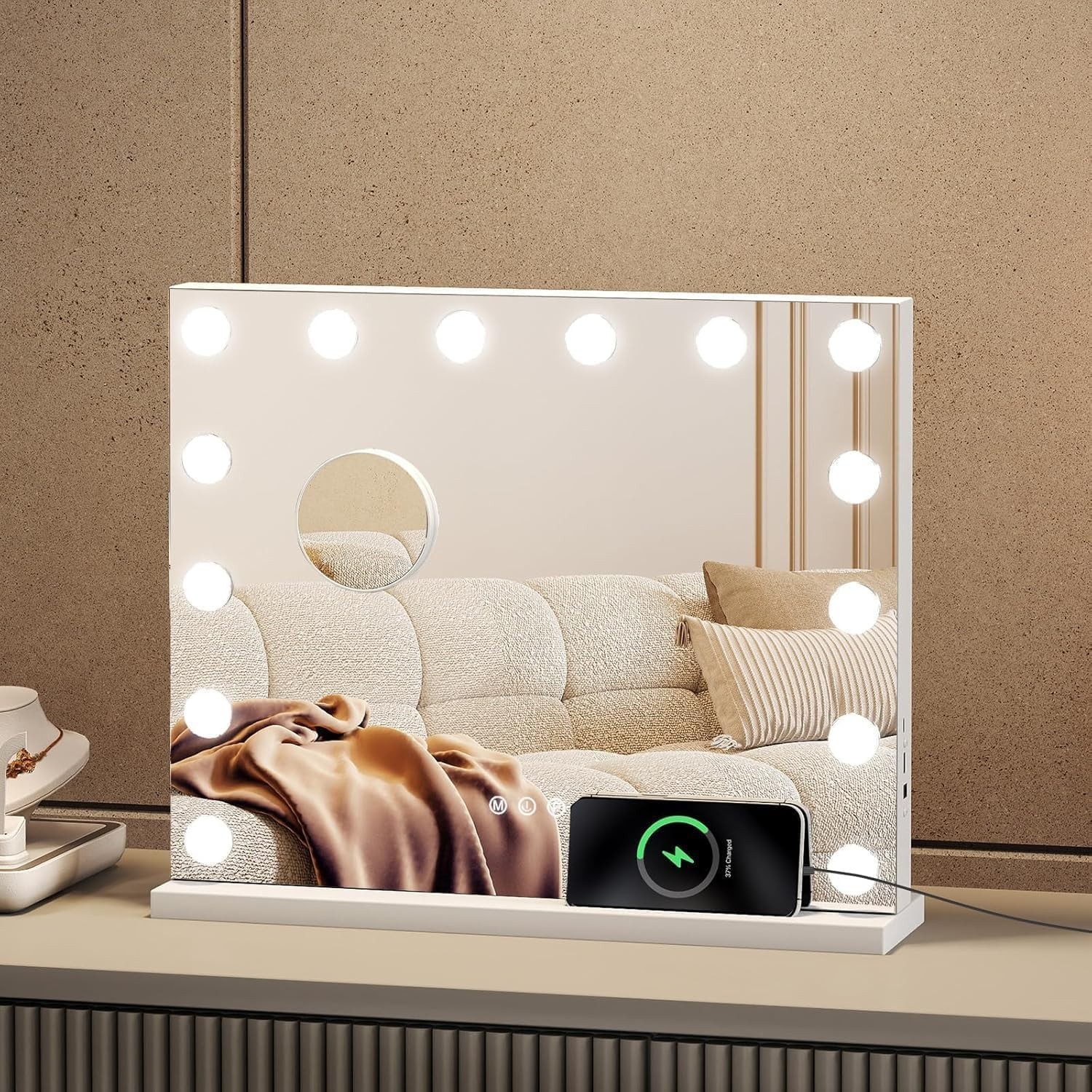 YOURLITE Hollywood Vanity Mirror with Lights, 58×46cm Lighted Makeup Mirror with Dimmable LED light, 3 Lighting Modes, Touch Control, USB+Type-C Charging Port, Tabletop and Wall Mounted