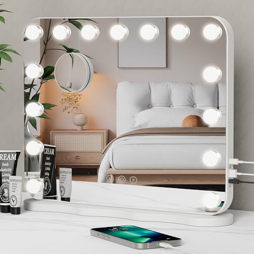 TUREWELL Hollywood Makeup Mirror with Lights,Large Lighted Vanity Mirror with 3 Color Light & 12 Dimmable Led Bulbs,Smart Lighted Touch Control Screen & 360 Degree Rotation(White)