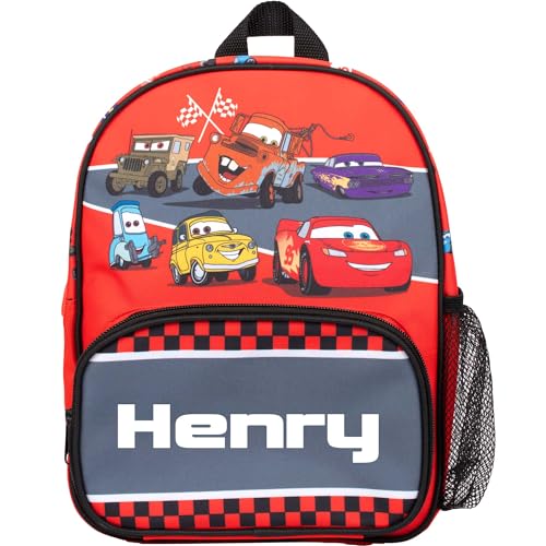 Disney Cars Personalised Kids Backpack, Toddlers Nursery Bag Mesh Water Bottle Pocket and Front Zipped Pockets, Personalised with any name Lightning Mcqueen Red