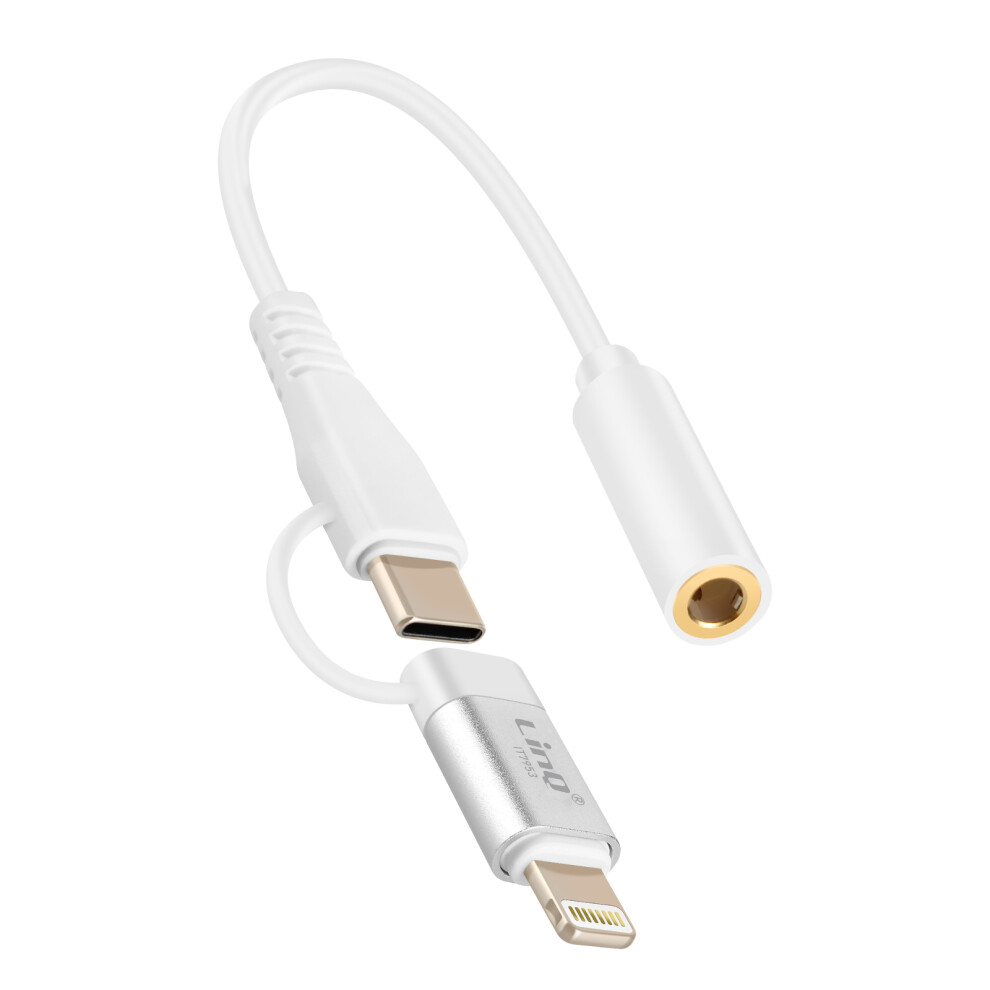 LinQ Audio Adapter Jack 3.5mm Female to Lightning and USB C Male, White