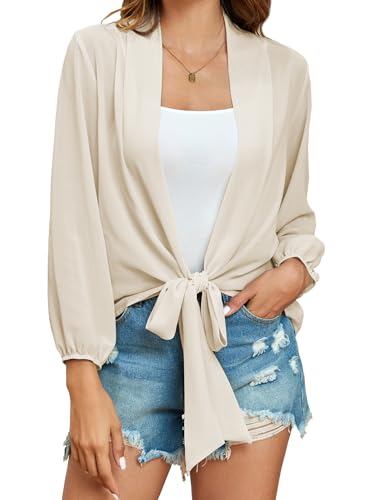 Famulily Women's Chiffon Shrugs Summer Lightweight Cardigans Tie Front Long Sleeve V Neck Blouse Tops (M, Beige)