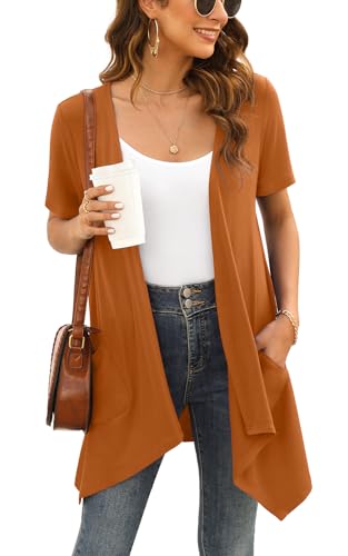 Wiwclo Plus Size Cardigan for Women Casual Soft Short Sleeve Duster Open Front Lightweight Kimono Summer Cardigans with Pockets Drape Hem,Brown,XXL
