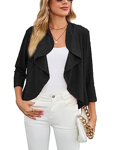 Famulily Ladies Summer Cardigans UK Eyelet 3/4 Sleeve Open Front Cardigan Lightweight Ruffle Outwear (M, Black)