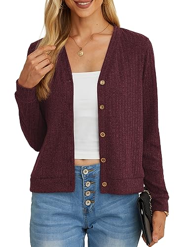GRECERELLE Women's Crop Cardigan Summer Long Sleeve V-Neck Button Down Knit Lightweight Outerwear Shrug Shawl Bolero Cardigans for Ladies (Wine Red, M)