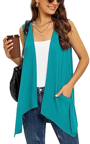Teal Vest Cardigan for Women Fashion Casual Open Front Lightweight Summer Cardigans Sleeveless Draped Kimono with Pockets Asymmetric Hem,S