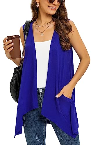 Royal Blue Vest Cardigan for Women Fashion Casual Open Front Lightweight Summer Cardigans Sleeveless Draped Kimono with Pockets Asymmetric Hem,S