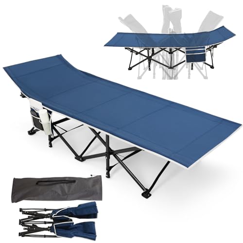 Warmiehomy Outdoor Single Camp Beds for Adults with Side Pocket, Lightweight Portable Tent Cot with Carry Bag, 600Lbs Load Capacity, Oversized Folding Sleeping Beds for Travel, Fishing, Hiking, Navy