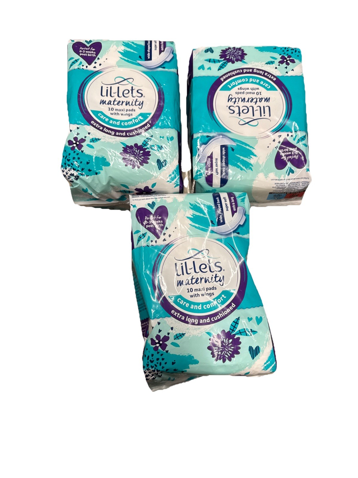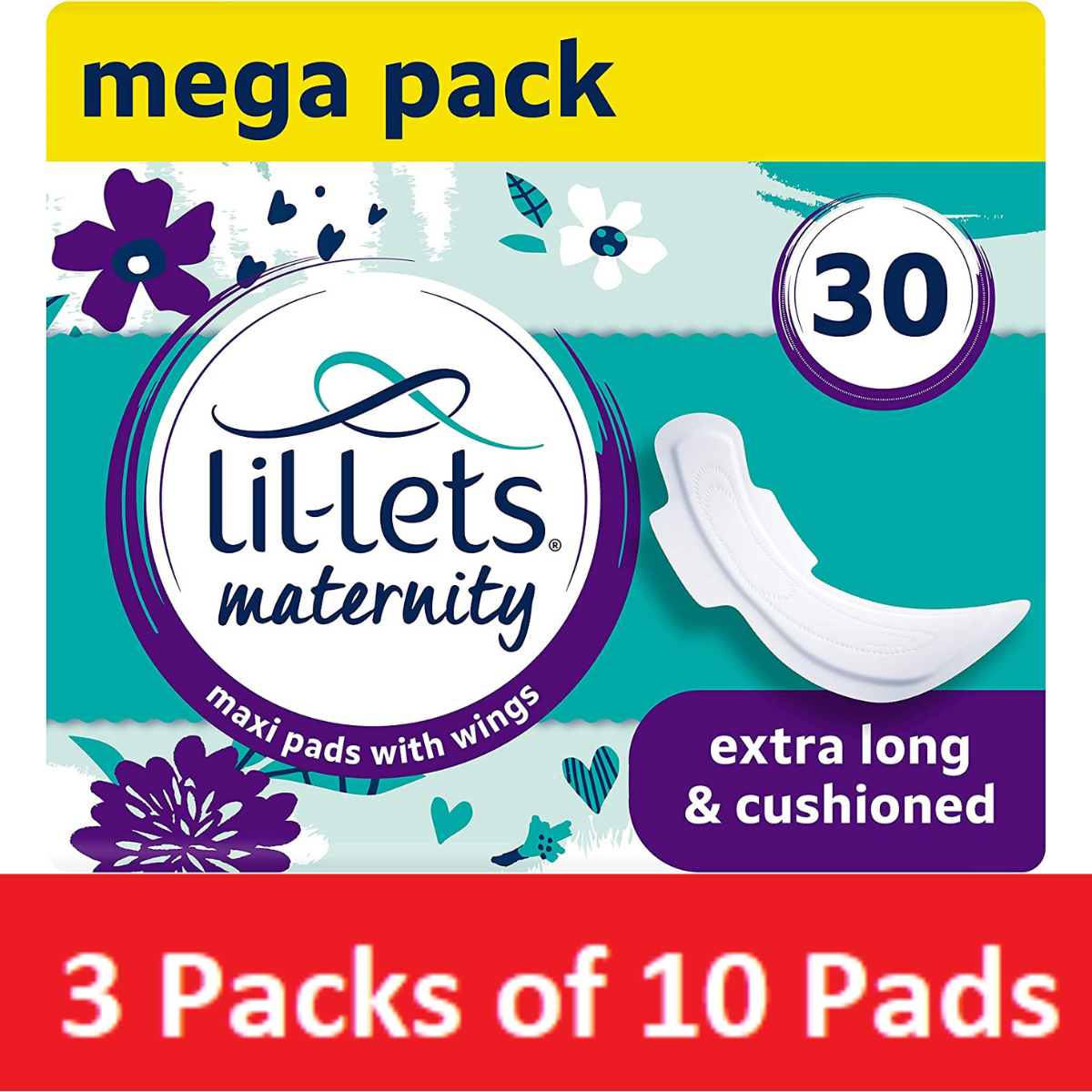 Lil-Lets Maternity Pads, Extra Long Maxi Thick Towels, With Wings, Postpartum/After Birth Essential, 3 Packs of 10 (30 towels), Packing May Vary