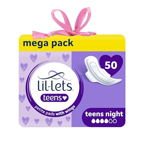 Lil-Lets Teens Night Pads X 50, Petite Towels for Girls & Teenagers, with Wings, for Heavy Flow, Unscented, Soft & Breathable, First Period Sanitary Towels, 5 Packs of 10 Pads - Bulk Pack