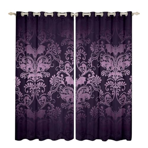 Homewish 30%-50% Blackout Curtains, Antique Victorian 2 Panels 66" Wx72 L, Vintage Floral Goth Drapes for Bedroom, Bats Sugar Skull Boho Baroque Decor, Purple Lilac