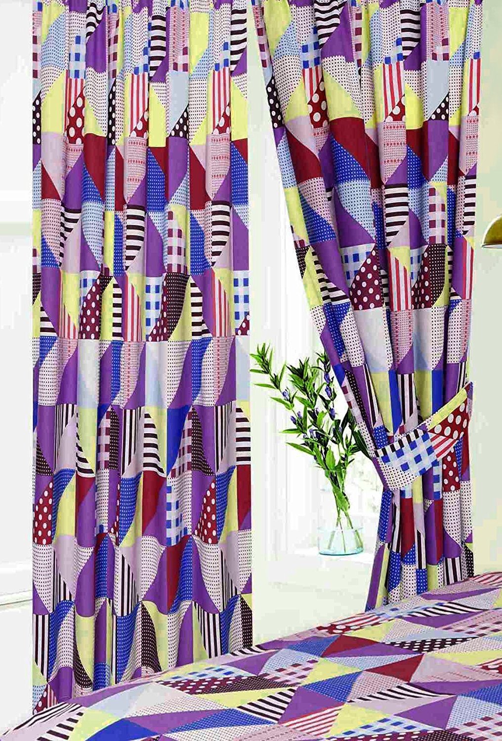 GEOMETRIC 66 x 72 BERRY LILAC RED YELLOW READY MADE PENCIL PLEAT CURTAINS MULTI