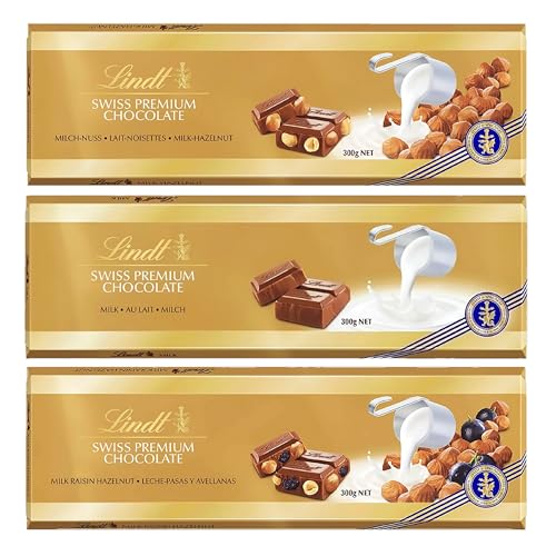 Swiss Lindt Chocolates Bars Bulk Buy - Luxury 3 x 300g Irresistible Smooth Hazelnut, Milk Bar & Hazelnut - Raisins Golden Milk Chocolate Bars for Chocolate Hamper, Birthday Gifts with Topline Card