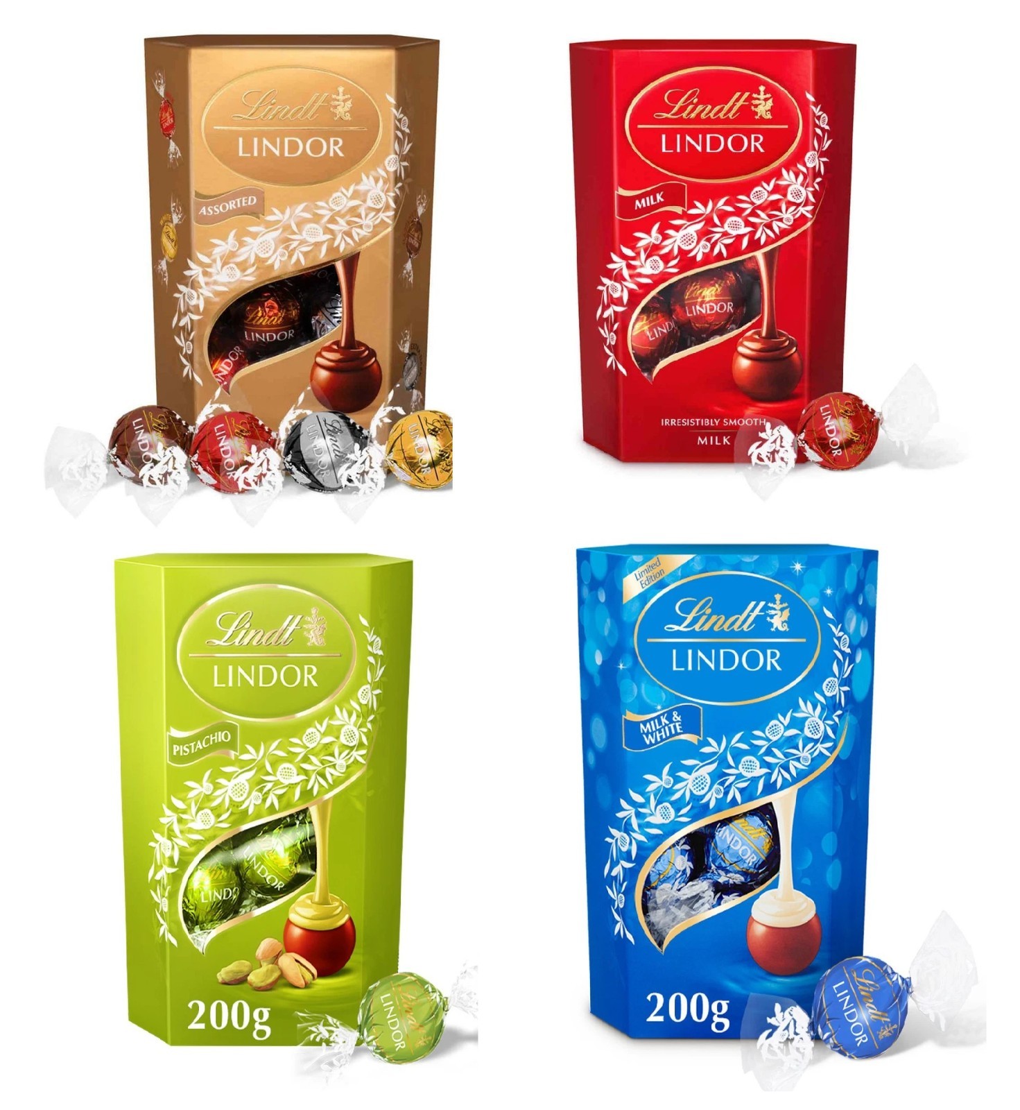Lindt Lindor Milk & White, Pistachio, Assorted, Milk Ball Truffles Gift 4 x 200g