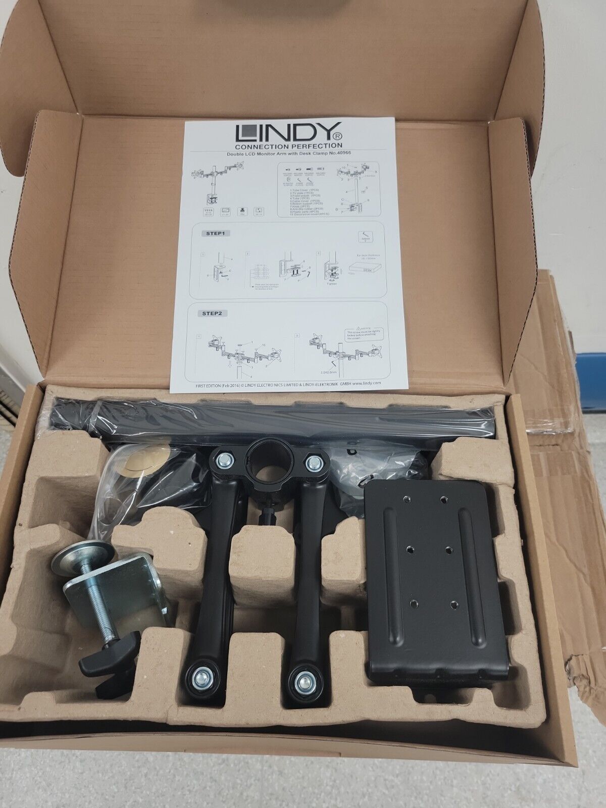 Lindy Double LCD Monitor Arm with Desk Bracket Clamp. Up to 10kg per Arm. B/N